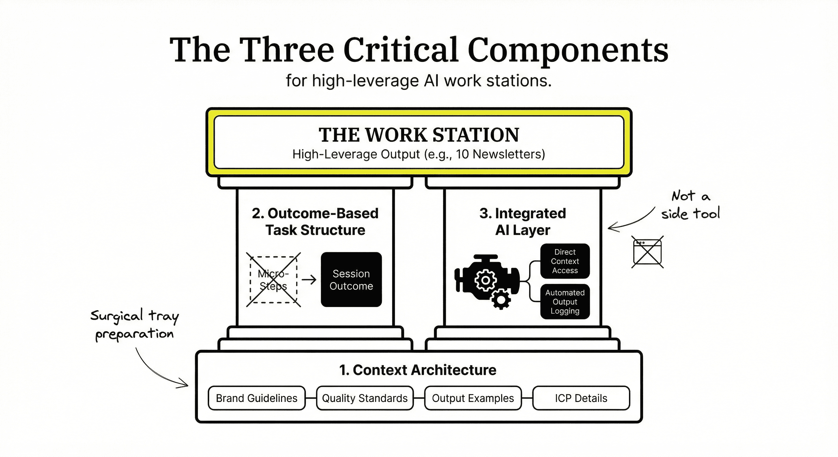 Your work station must have rich context loaded before work begins. Brand guidelines, quality standards, output examples, ICP details. Think of it like setting up a surgical tray—everything in place before you start.