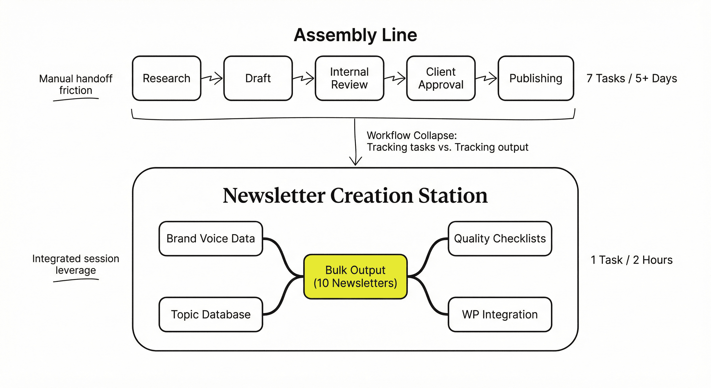 Her team spent 6 hours creating one client newsletter. They had tasks for ideation, drafting, review, edits, approval—the whole assembly line.