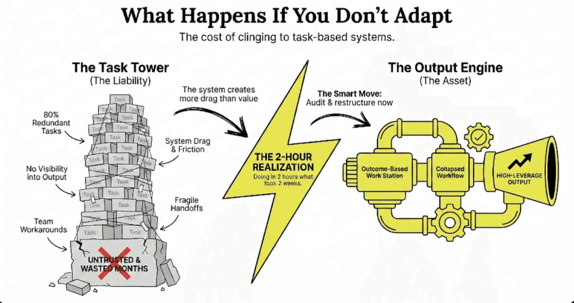 Companies are spending $15K-$50K building elaborate ClickUp or Asana systems based on task-list thinking. In 18 months, they'll need complete rebuilds.